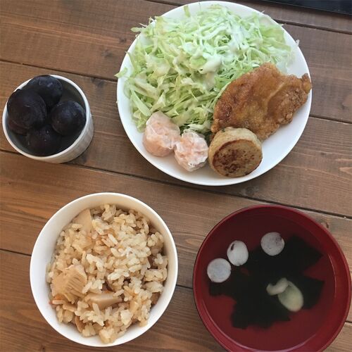こんにちは!すなふらです。平常運転です。元気取り戻し中!! あとは雨が降らないことを願うばかり。 さて、今日のひとりごはん。 筍の炊き込みご飯、お吸い物、肉たち、千切りキャベツ、ぶどう。 昨日の余り物をがっつり食べました! かなりたらふくですが…