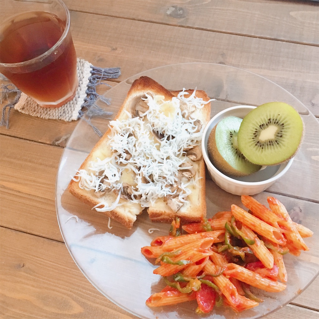 しらすとマッシュルームのトースト、ペンネのナポリタン、キウイ。