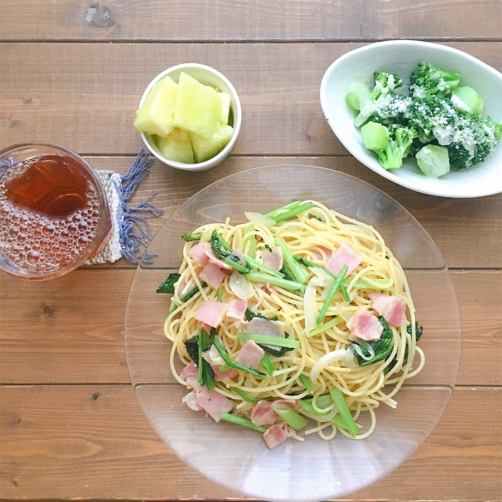 青菜とベーコンのペペロンチーノ、茹でブロッコリー、メロン。