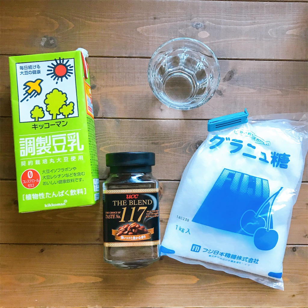 水、インスタントコーヒー、グラニュー糖、そして牛乳(もしくは豆乳でも)